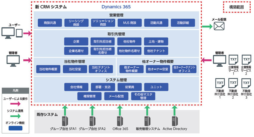 SCSKと正式に契約を交わした三菱地所は2018年1月にプロジェクトを始動させ、およそ4カ月をかけて新しいCRMシステム基盤の要件を定義することにした。プロジェクトにはシステム刷新を主導する経営企画部(のちにDX推進部)、システム開発・運用を担当する情報子会社のメック情報開発(MJK)のほかに各営業担当部署のメンバーも参画。SCSKからの技術的な提案をベースに、要件を固めながらシステム設計を行った。
