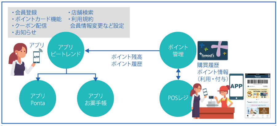 また、同社は会員アプリと大手ポイントサービス「Ponta」との連動も実現している。トモズのポイントカードの顧客の4割がPontaカードの保有者だが、この連動によりアプリ一つで完結できるようになり、レジにおける利便性向上につながっているという。