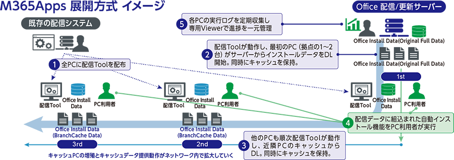 実は同社にはすでにソフトウェア配信の仕組みが存在しており、Winテクノロジ はこの仕組みを活用した展開・更新機能を考案した。更にBranchCacheを併用することで、M365Apps展開・更新におけるネットワークトラフィックを大幅に削減できることも判明した。