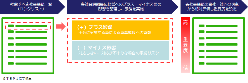 それぞれの課題が経営に与える「プラス影響」と「マイナス影響」を自社・社外の視点から相対的に評価する事で重要度を設定。