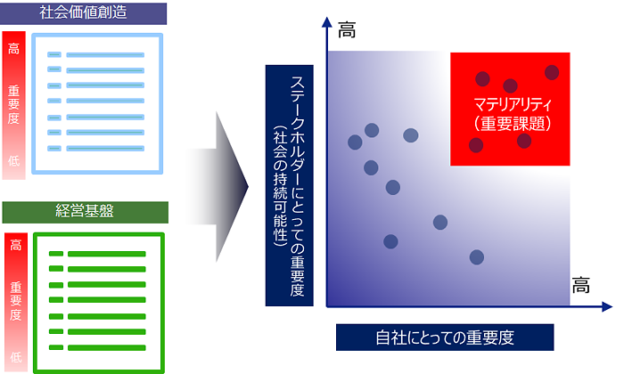 「経営視点」と「ステークホルダー視点」でマテリアリティ・マトリクスにマッピング。