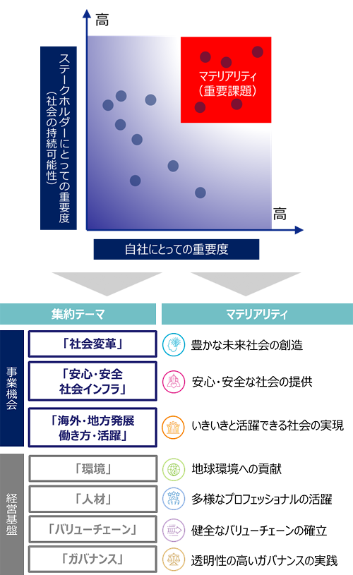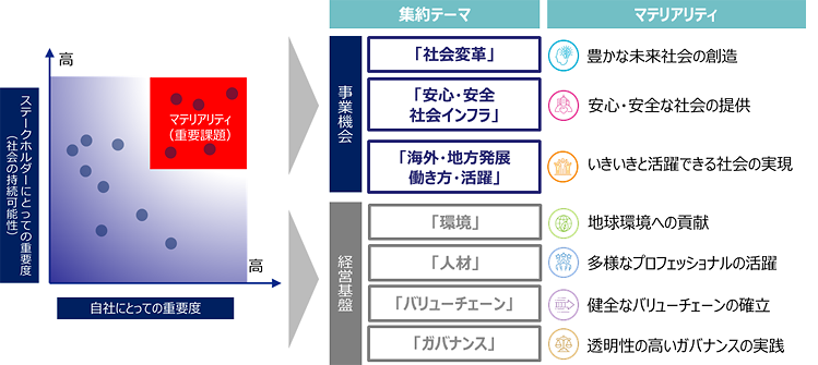 経営理念「夢ある未来を、共に創る」の実現に向けて、社会が抱えるさまざまな課題を事業視点で評価し、