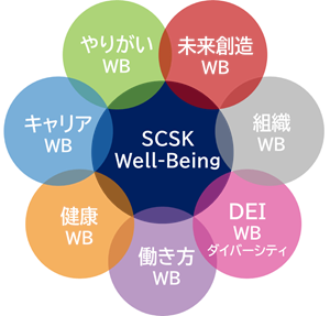 Well-Being経営の指針として定義した「SCSKにおけるWell-Beingの7つの価値観」に基づき、具体的な施策を展開することで、社員一人ひとりへの浸透と組織風土の醸成を図っています。今後は、「働きやすさ」から「働きがい」へと重点を移し、「やりがい」と「未来創造」に満ちた新しい企業風土の構築を目指します。社員一人ひとりが健康を大切にし、自分らしい働き方を実現しながら、未来に向けた新しい挑戦に前向きに取り組む環境づくりに、これからも力を注ぎます。