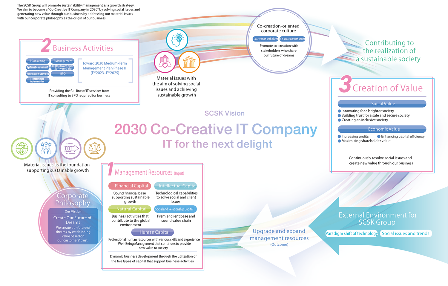 We aim to become a "Co-Creative IT Company in 2030" by solving social issues and generating new value through our business by addressing our material issues with our corporate philosophy as the origin of our business.