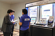 展示ブースでは、ノンキャッシュでWAN高速化を実現する「RAPICOM V3」と、国内導入台数5,000台を達成したPureFlowシリーズのハイエンド機「PureFlow GSX-XR」を実機展示し、SCSKが提供する次世代のネットワークソリューションについてご来場者の皆様にご紹介しました。あわせて、WAN回線の効率化を促進するこの2つのソリューションを組み合わせることによって生まれる付加価値の相乗効果について、詳細にご説明しました。