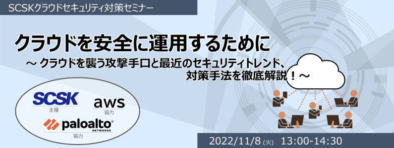 サイバーセキュリティ対策で世界的リーダーのパロアルトネットワークス株式会社、および、世界中で広く採用されているクラウドプラットフォームを提供するアマゾン ウェブ サービス ジャパン合同会社を迎え、クラウドにおける最近の攻撃・セキュリティトレンド、AWS環境におけるセキュリティ強化方法をお伝えすると共に、SCSKによるCSPMを使ったセキュリティ対策など、クラウド活用を推進する上で有意義な情報をご紹介します。