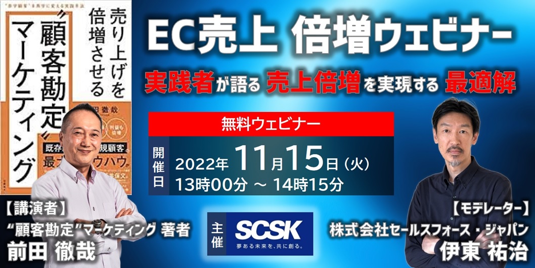 本ウェビナーでは、大手専門店ECサイトを率いて売り上げを倍増させた、”小売業界の伝説のマーケター”と呼ばれた前田徹哉氏が、売り上げ・利益を大幅に伸ばすメソッド「顧客勘定」を解説。セールスフォース・ジャパンの伊東祐治氏をモデレーターとして迎え、お二人で熱く語って頂きます。