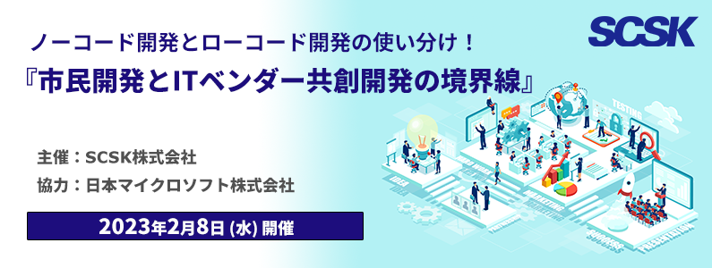 本セミナーを通じて、ノーコード開発サービスを使った市民開発とローコード開発サービスを使ったITベンダーとの共創による開発の用途・業務範囲を明確化して、企業のデジタル化推進に役立てていただきたいと考えています。セミナー本編では、実際のノーコード・ローコード開発サービスであるMicrosoft社のPower PlatformとSCSK株式会社のCELFを例に、具体的な使い分けをイメージしていただける内容となっています。