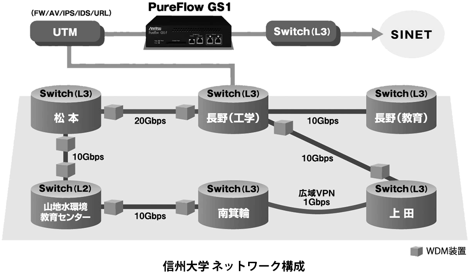 信州大学は、「PureFlow® GS1」を、8学部を結ぶ学内ネットワークとSINET※3を繋ぐゲートウェイ※4上に組み込み(別紙参照