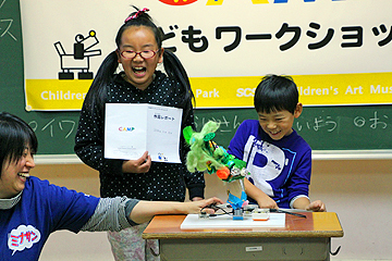 当日は、女川向学館に通う小学1年生から5年生までの14名が参加し、女川名物・さんまの大漁を祈るダンス「さんまDEサンバ」のリズムに合わせて踊る、カラフルで楽しい動くおもちゃをつくりました。