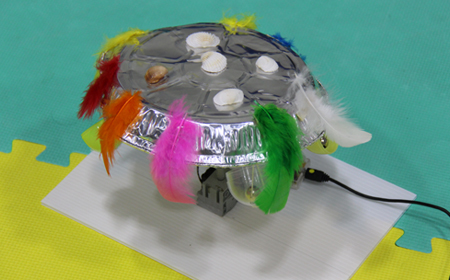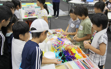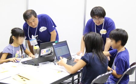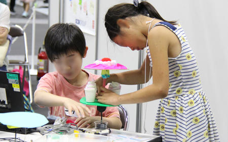 開催期間中、CAMPブースでは乾電池式の小さなコンピューター「クリケット」と、モーターやスピーカー、身近な材料を組み合わせ、「プログラムで動く未来の乗り物づくり」を、次代のモノづくりを支える小さなエンジニアたちに体験していただきました。