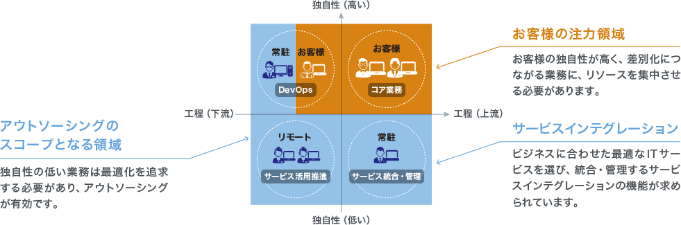 システムのみならず、開発と運用もオンサイトとリモートのハイブリッドで提供することで、品質とコスト効率を継続的に改善します。