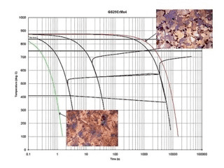 MAGMAsteelモジュールでは、熱処理プロセス中の境界条件を詳細に設定でき、それによって求めた精緻な温度遷移とCCT線図を基に鋳鋼品の各部位の組織比率を予測します。また、これを利用し機械的特性の予測も行います。
