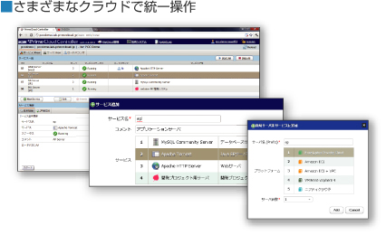 VMWare、Eucalyptus、CloudStack、AWS、NIFTY Cloud、IDCフロンティア、NTTCom Cloud n、USiZE、Microsoft Azure、OpenStack - 2. Web、AP、DBなどミドルウェアなども自動設定