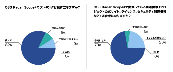 | 図1 | アンケート集計の例。「OSS Radar Scope® のランキングは役に立つ」(82%)や、「OSS Radar Scope®で提供している関連情報は参考になる」(73%)など |