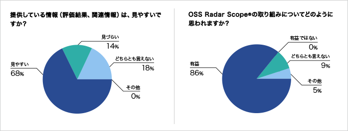 | 図2 | アンケートの例。「提供している情報は見やすい」(68%)や「OSS Radar Scope®の取り組みは有益」(86%)などの答えも |