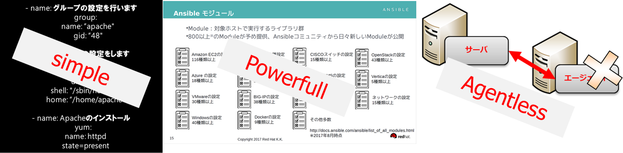 | Simple | Playbookと呼ばれるファイルに環境構築に関する設定情報をYAMLにより定義します。 |