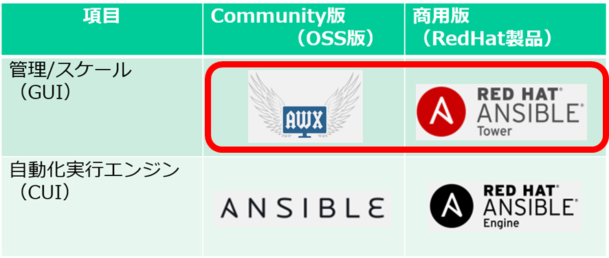 OSS版(AWX)と商用版(Ansible Tower)はほぼ同じため、本稿においてはOSS版(AWX)を用います。また、RedHat系のフリーOSであるCentOS7上に導入する手順を紹介します。