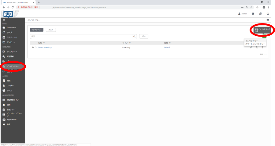 2. インベントリー一覧の画面において追加ボタンをクリックし、インベントリーを選択します。