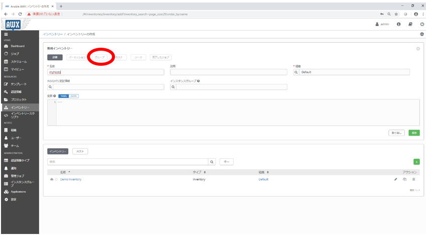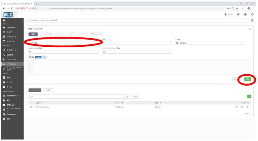 3. 遷移後の画面においてインベントリーにつける名称を記載し、保存ボタンをクリックします。