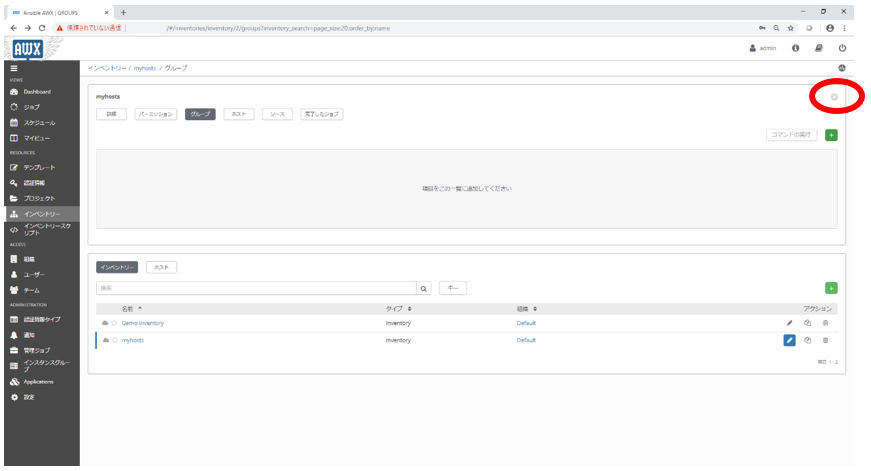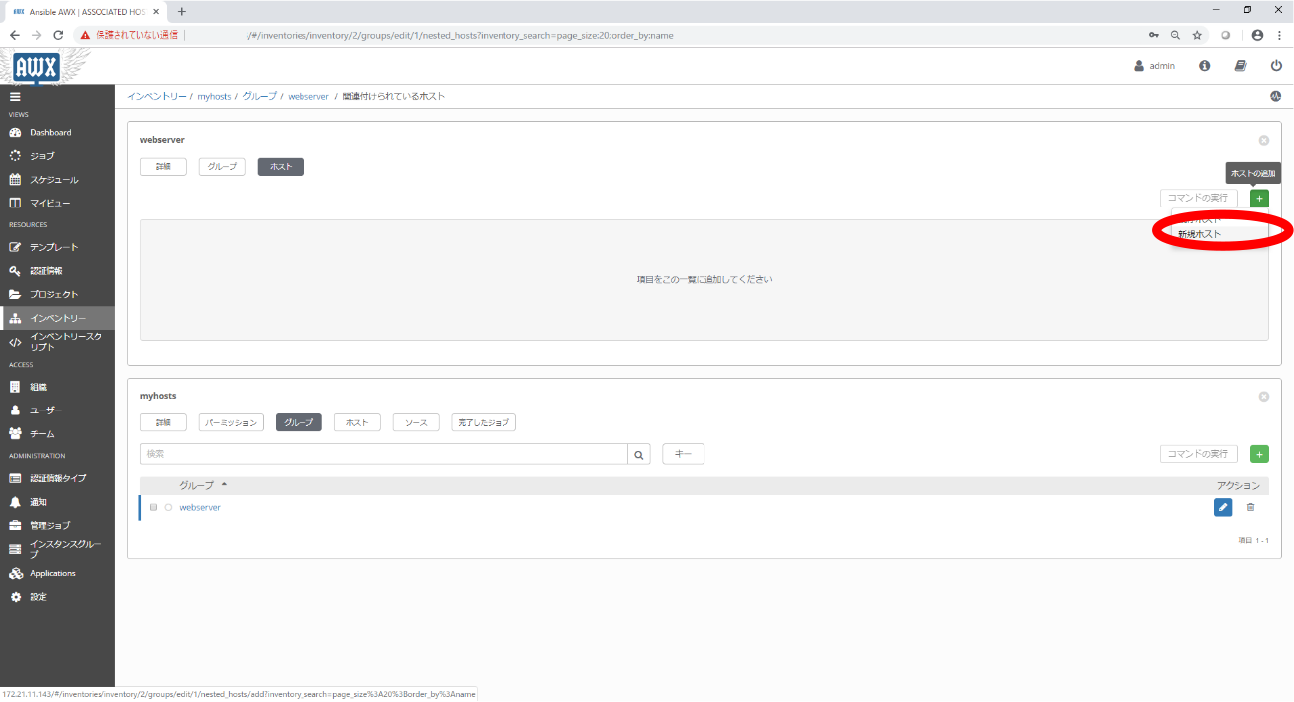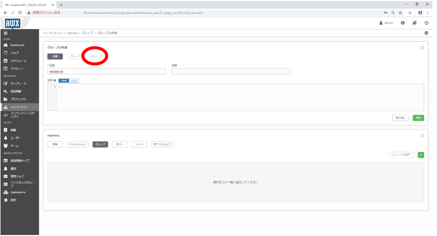 | 新規インベントリ | 名前 | myhosts |