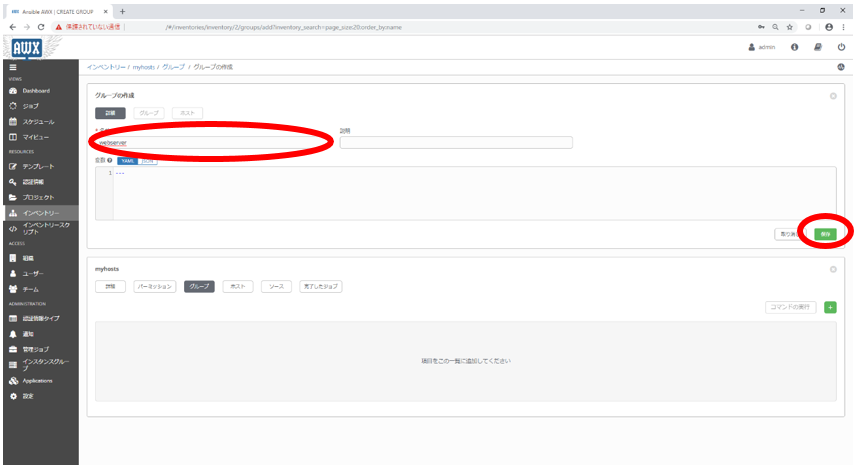 6. グループの作成の画面においてグループ名を入力し、保存ボタンをクリックします。