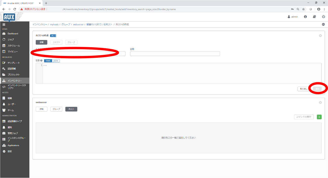 9. ホストの作成の画面においてホストの情報を入力し、保存ボタンをクリックします。