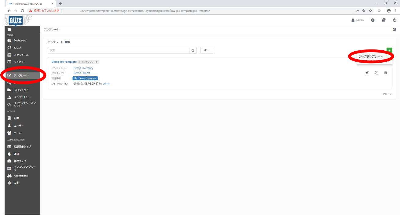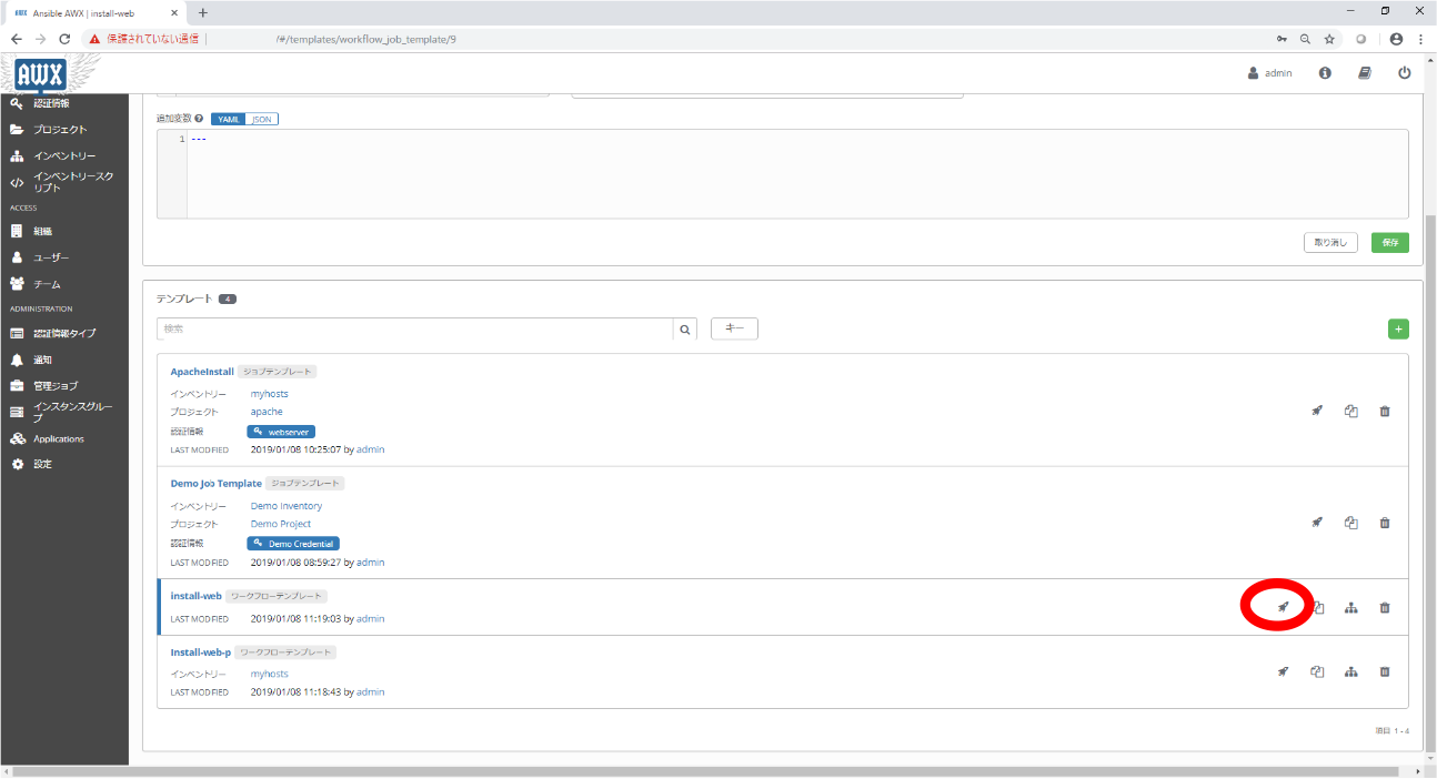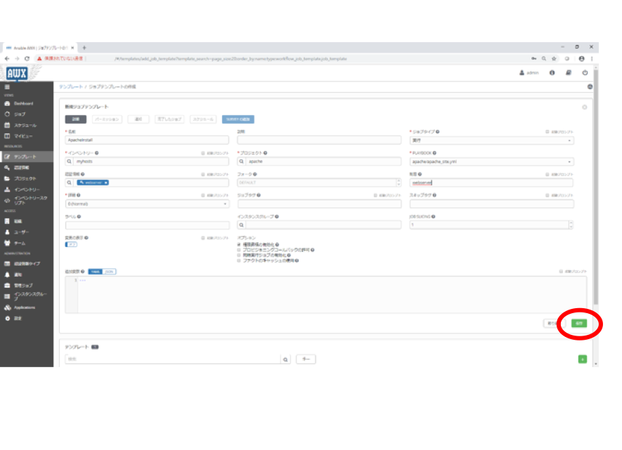 | 3-4 | 「ジョブテンプレート」の登録 | 「プロジェクト」、「認証情報」、「インベントリー」を関連付けます |