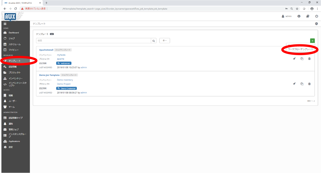 ワークフロージョブテンプレートはプロジェクトやジョブテンプレート、別のワークフロージョブテンプレートを順番に実行するワークフローを作成する際に使用します。