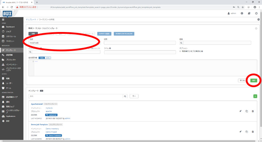 3. 遷移後の画面においてワークフロージョブテンプレートにつける名称を入力し、保存ボタンをクリックします。