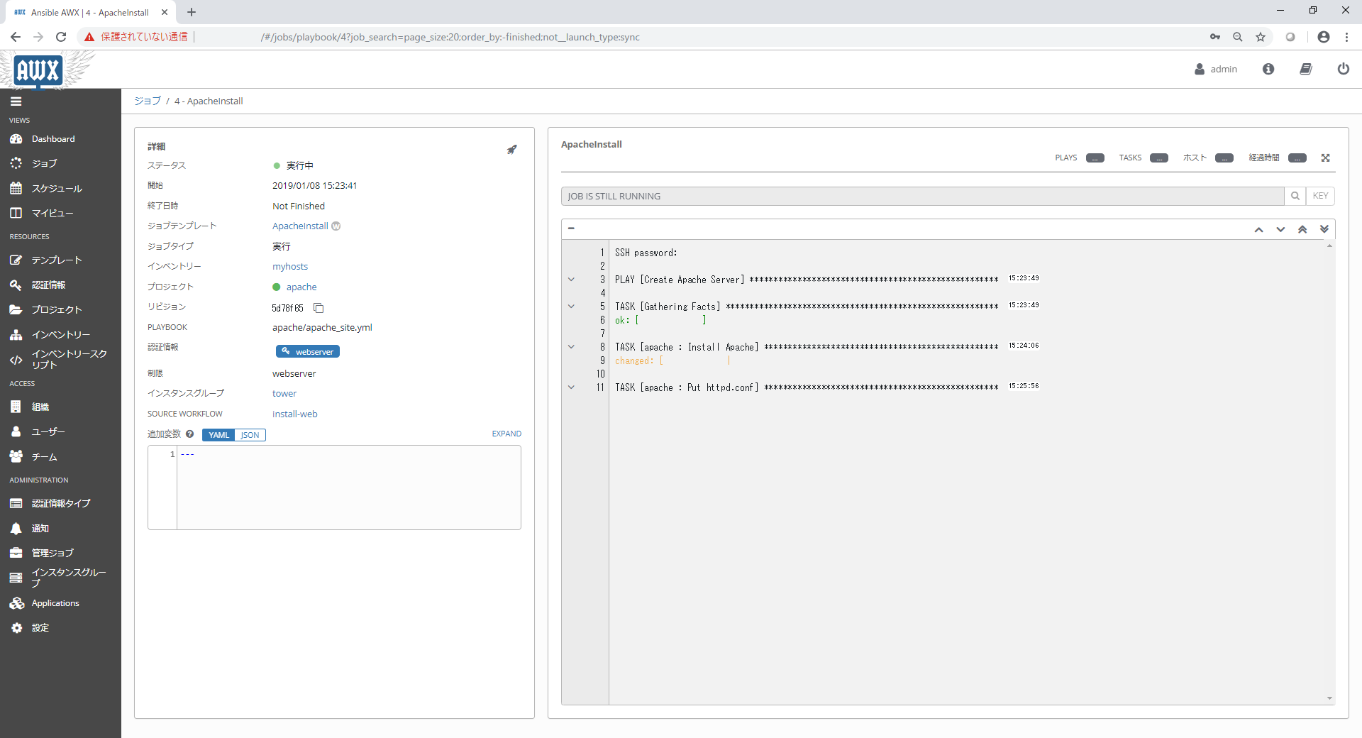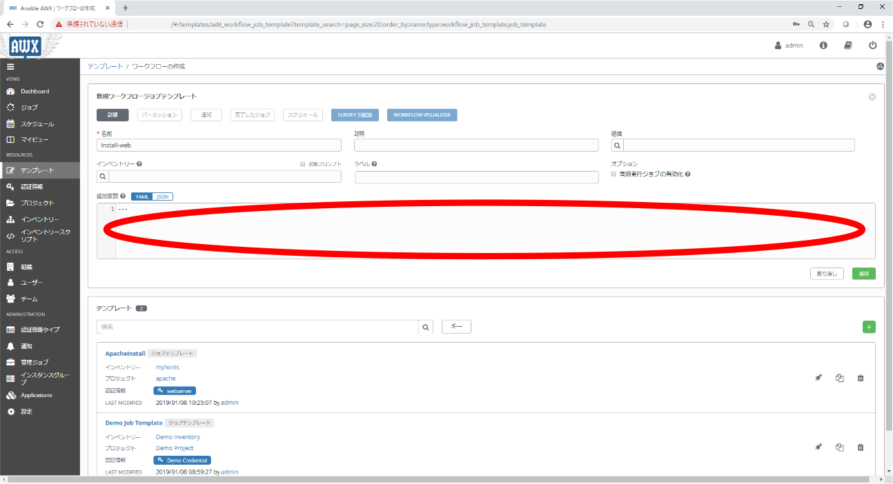 ジョブテンプレートは特定のホスト・グループに対して1つのPlaybookを実行するときに使用します。Playbook内で変数を使用するようにしている場合、ジョブテンプレートの設定の中で合わせて変数の値を定義することも出来ます。