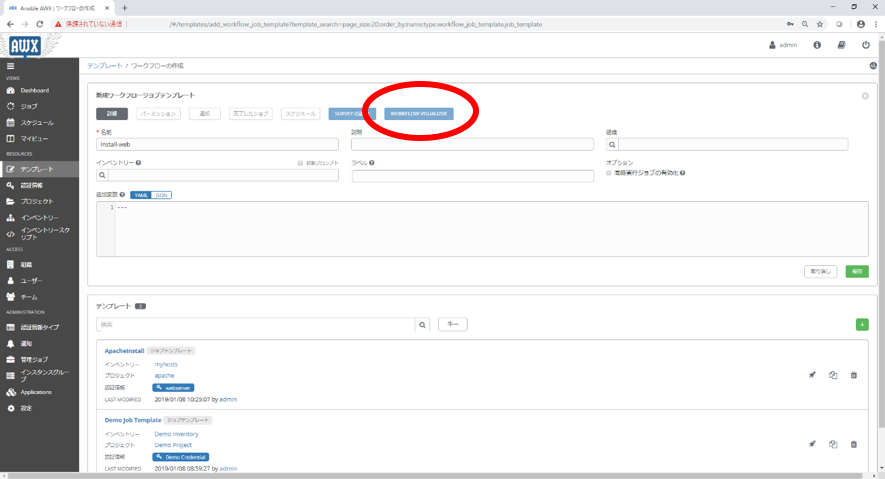 複数のPlaybookや複数のジョブテンプレート、作成済みのワークフローを自動で順番に実行したい、前作業の成否によって実行する処理を変えたい等の場合、ワークフロージョブテンプレートも設定します。