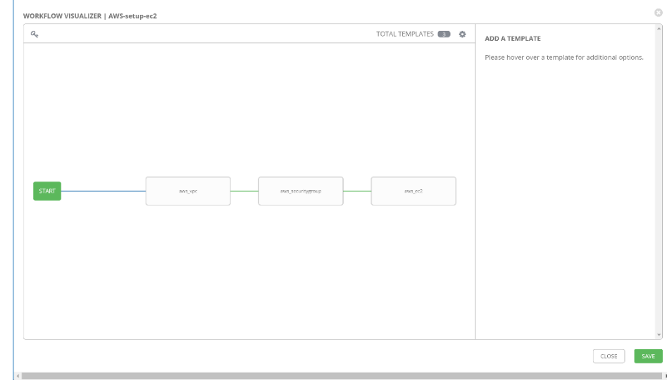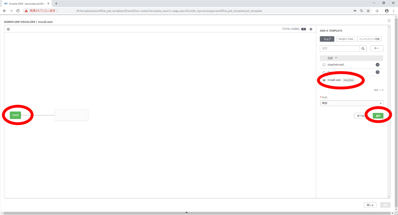 5. STARTのボックスをクリックすると空白のボックスが表示されます。併せて画面右にジョブテンプレートが選択できる設定画面が表示されます。表示されたジョブテンプレートの一覧から必要な物を選択し、選択ボタンをクリックします。登録が終了したらSAVEボタンをクリックします。