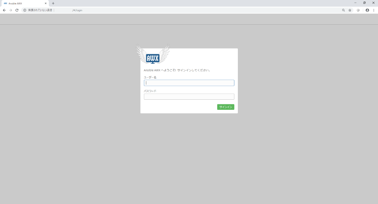 インストールが完了するとawx_task、awx_web、memcached、rabbitmq、postgresの5つのコンテナが構築されます。ブラウザ(Google ChromeもしくはMozzila FireFoxを使用してください)でインストール先サーバのIPアドレスにアクセスすると、構築中の画面が表示されます。