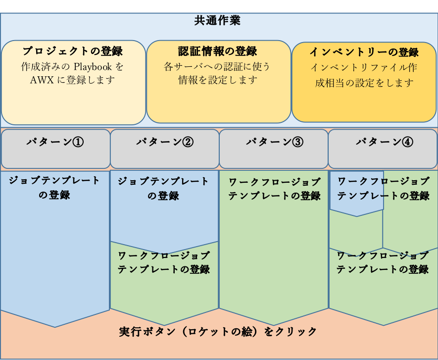| 3-1 | 「プロジェクト」の登録 | 作成済みのPlaybookがどこにあるかAWXに認識させます |