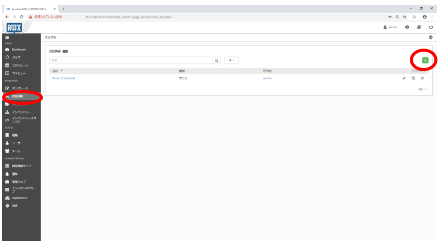 2.認証情報の一覧画面において追加ボタンをクリックします。