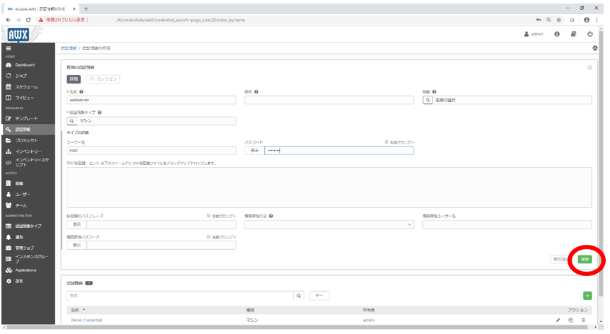 AWXから各構築対象のサーバに対してのログイン方法を設定します。