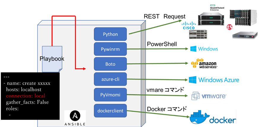 WindowsやAWS等はPythonでの操作を可能とするモジュールが用意されています。Ansibleにもこれらモジュールを使用するためのモジュールが用意されています。Playbook内で必要な情報を与えることで、操作するためのPythonスクリプトを作成、実行してくれるので、Pythonプログラミングの知識を必要とせずに操作することが可能となります。
