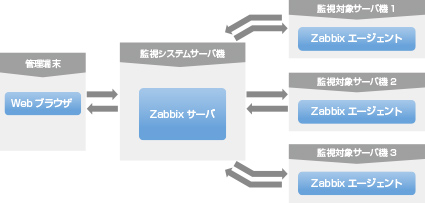 各監視対象にインストールされたZabbixエージェントを利用して、Zabbixサーバに情報を収集して、Zabbixサーバで閾値判定などを行って、障害発生と判断した場合にメールでの障害通知を行うようになっています。