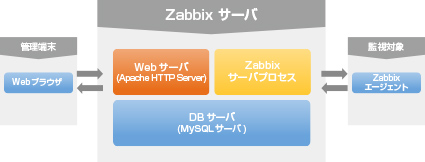 もう一段階Zabbixサーバの部分を詳しく説明すると、以下のようなプロダクトで構成されています。