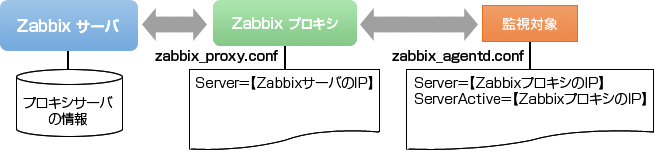 zabbix_proxy.confとzabbix_agentd.confの設定を再度振り返っておきますが、それぞれの設定は以下の図のような関係になることにご注意ください。