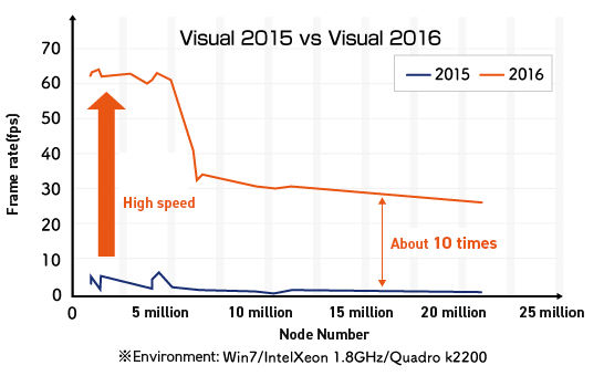 High-speed display is possible using a uniquely developed drawing process. Assembly models with more than 30 million nodes and more than 1,000 parts can be visualized freely and interactively, from the entire structure to the details.