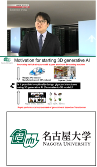2022年以降、Dream Fusion(Google)、Magic 3D(NVIDIA)、Point-E(OpenAI)をはじめとする3D生成AI(text-to-3Dモデル)が続々と登場しています。ただし、自然言語・画像・動画に比べ3D形状のデータセット数は少なく、構造力学的情報が含まれたデータセットは提案されていません。名古屋大学様では、構造最適設計が難しいギガキャスト構造等への応用を目指し、スーパーコンピュータ「富岳」による超多ケース弾塑性解析で作成したデータセットに基づく3D生成AI(parameter-to-3Dモデル)の研究を進められています。本基調講演では、その現況と今後の展開について、また日米欧で活発化している科学研究向けAI基盤モデルの開発、シミュレーションとAIを組み合わせた計算の高度化等のAI for Scienceの最新動向についてもご講演いただきました。