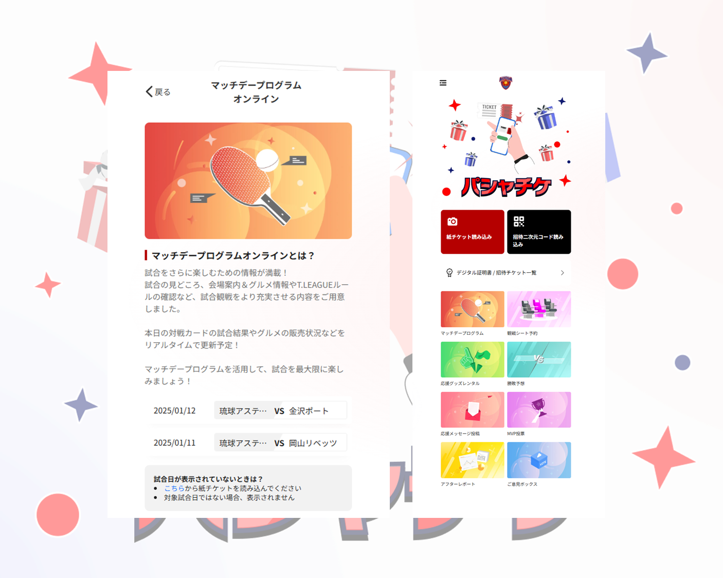 紙チケットをアプリから撮影するだけで、特別なチケット所有証明書が手に入り、観戦をさらに楽しめる機能が満載です。熱い試合を、より一層楽しい体験とともにお楽しみください。