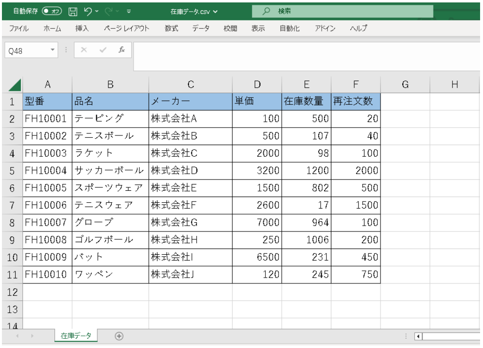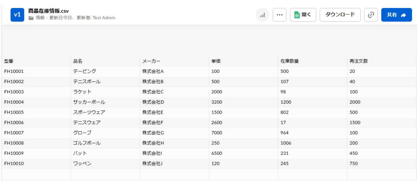 今回連携するCSVファイル「/data/work/test/在庫データ.csv」の内容は以下の通りです。