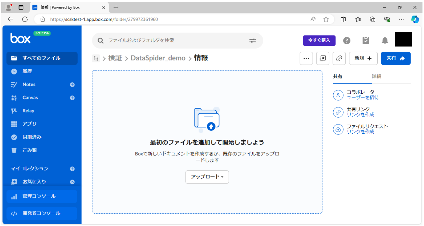 また、今回アップロード先として設定しているBoxフォルダは以下の通りです。