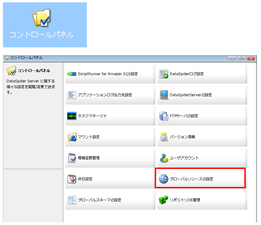 Studioの左下にある、「コントロールパネル」アイコンをダブルクリックし、「グローバルリソースの設定」を選択します。