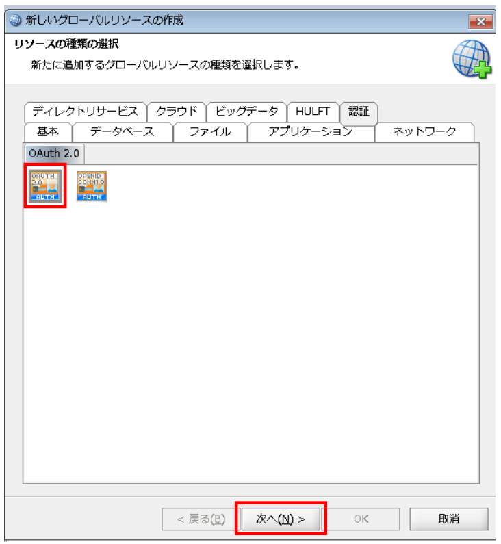 リソースの種類の選択画面から、[認証]-[OAuth2.0]-[OAUTH2.0]を選択し、[次へ]ボタンを押下します。