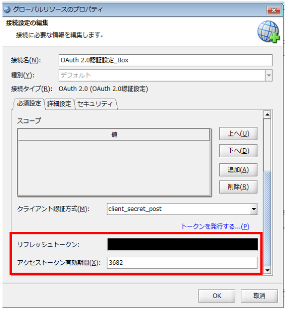 接続設定の画面で、[リフレッシュトークン]と[アクセストークン有効期間]が設定されていることを確認します。