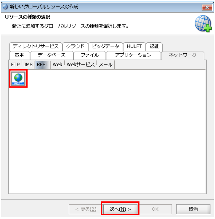 リソースの種類の選択画面から、[ネットワーク]-[REST]-[REST]を選択し、[次へ]ボタンを押下します。